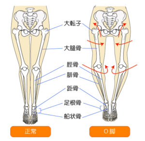 膝が外側に広がり、真っすぐ見た時にアルファベットの「O」に見えることからO脚といわれます。